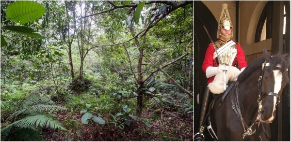 В рамках месячника улучшений навыков разведки и патрулирования, британские кавалеристы проводят учения в суровых джунглях Брунея. На странице The Army in London в фейсбук выложили фотографию с этих учений, с просьбой найти 12 кавалеристов, которые замаскировались в джунглях. Снимок поставил пользователей интернета в тупик, практически ни кто не смог справиться с задачей. Позже была опубликована фотография с отмеченными на ней солдатами. На этой фотографии замаскировались 12 английских кавалеристов (они конечно не в такой форме, как на первом снимке): Вот так кавалеристы выглядят в парадной форме во время торжественных мероприятий: Вот кавалеристы на учениях: Источник