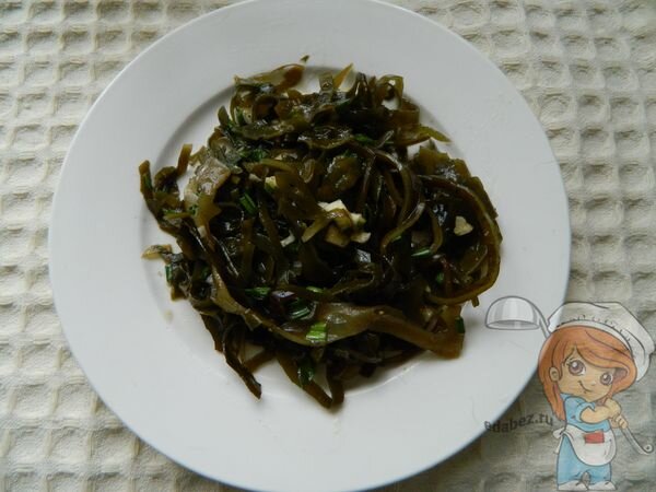 Ламинария готова, ее можно кушать, но она в таком виде пресная. Добавьте к ней несколько зубочков чеснока и немного свежей зелени.