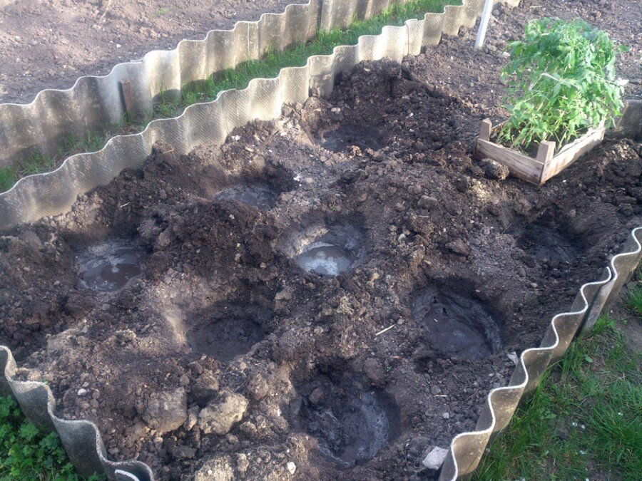 Вот так приготовили ямки, в которые полили воды, затем разложили рассаду по ямкам и засыпали землей. Землю сверху чуть придавили рукой, чтобы сохранить влагу и росток плотно держался в грунте.
