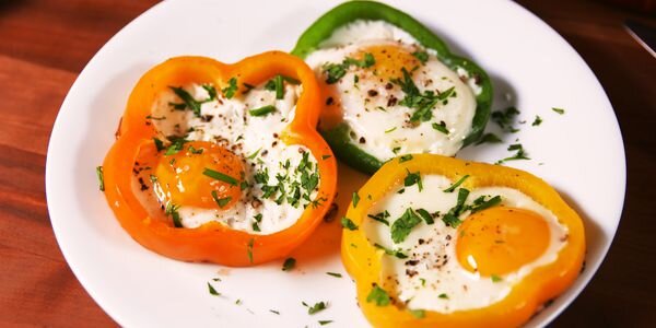 Ингредиенты Болгарский перец нарезанный кольцами 6 яиц Морская соль среднего помола Свежий молотый черный перец Измельченный зеленый лук Пару веточек нарезанной петрушки ВРЕМЯ ПОДГОТОВКИ: 5 минут ОБЩЕЕ ВРЕМЯ 20 минут