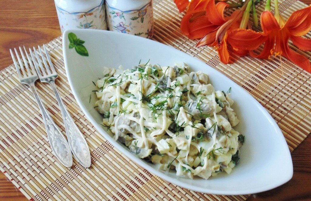 Простые блюда как правило оказываются самыми вкусными . Предлагаю вашему вниманию простой в приготовлении но очень вкусный салат с копченной курицей и маринованным луком. Этот салат будет идеальным дополнение к ужину или праздничному столу.
