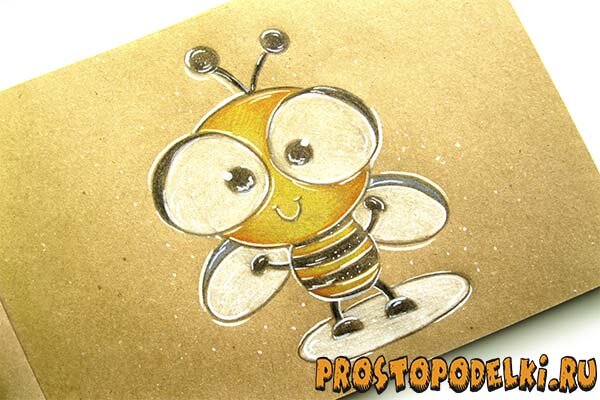Пчелки- настоящие труженицы. Ведь они собирают пыльцу с каждого цветочка и перерабатывают в сотах на полезный и вкусный продукт – мед. Познакомьте ребенка с таким насекомым при помощи рисования цветными карандашами. Для этого сперва делаем набросок рисунка и определяем общие пропорции туловища головы пчелки. После прорисовки контура всего рисунка можно переходим к раскрашиванию. Для яркости и насыщенности иллюстрации следует использовать белый карандаш и маркер. Необходимые материалы: Этапы рисования: Изобразим голову пчелы в виде большой окружности. Затем дорисуем внизу маленькое туловище. Будет оно иметь форму овала. Пусть границы овала и окружности немного пересекаются. По бокам туловища получим небольшие овальные крылышки. На мордочке рисуем большие глаза и маленькие зрачки, а также рот. Дорисовываем в верхней части рисунка небольшие рожки. Для этого используем простые геометрические формы. Туловище пчелы сделаем полосатым, прорисовав на нем равномерно полоски. По бокам туловища д