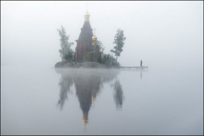 Эта совсем небольшая церковь может по-настоящему заворожить своей красотой и умиротворением потрясающей природы вокруг. Будто сошедший со страниц русских сказок, храм Андрея Первозванного на Вуоксе является таким местом, который оставляет неизгладимый след в душе каждого, кто приезжает его посетить. Храм Андрея Первозванного находится в Ленинградской области на реке Вуокса, недалеко от финской границы. Это одна из многих церквей, построенных на острове, однако единственная в мире, которая стоит на монолитной скале посреди воды, и этот факт позволил внести церковь в Книгу рекордов Гиннеса. Внутренне убранство церкви. Резные окна. Церковь построили относительно недавно - в 2000г, и с тех пор она стала местной достопримечательностью, ради которой приезжают обычные туристы и верующие люди. В ней регулярно проходят службы, можно также обвенчаться или покрестить ребенка. Добраться в церковь можно только на лодке, так как мост на остров пока не построили. Да и постоят ли, трудно сказать: ос