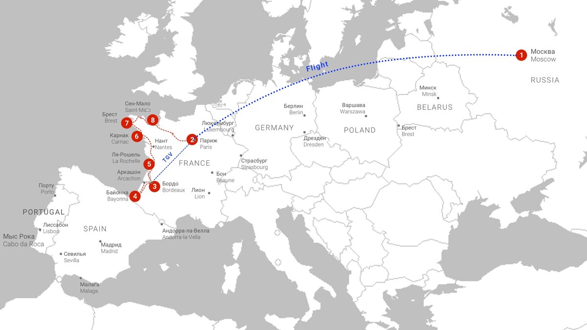 Бордо: архитектура, Монтень и винодельни. Байонна: культурная столица басков. Аркашон: океан, устрицы и дюны. Ла-Рошель: крепость, парусники и морской музей. Карнак: тысячелетние мегалиты и друиды. Брест: древний монастырь и маяк. Сен-Мало: столица пиратов. Мон-Сен-Мишель: известный монастырь в готическом стиле. И Париж... План был такой: http://sergeypashkov.ru/travel/france_start Прилетаем из Москвы в Париж. На TGV за 3 часа "долетаем" до Бордо. Берем заказанную машинку и, – вперед по всему западному побережью Франции от Бордо до Мон-сен-Мишель на севере. Сдаем машину, и возвращаемся на поезде в Париж. И погуляв по Парижу пару дней вылетаем на Родину. Но в процессе многое изменилось... Бордо (Bordeaux) - уж очень хотелось побывать на родине знаменитых французских вин и великого философа Мишеля Монтеня. Потом заехать в Страну басков, граничащую с Испанией, ориентир – города Сент Жан-де-Люз (St. Jean-de-Luz) и культурная столица басков – Байона (Bayonne). А там рядом и Биариц (Bia