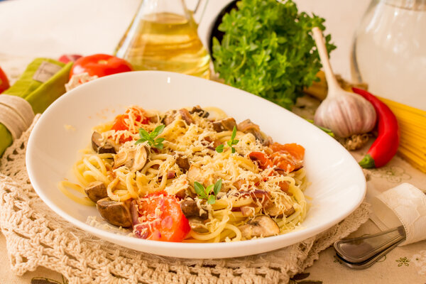 Спагетти с шампиньонами, овощами и сыром - быстрое погружение в итальянскую атмосферу
