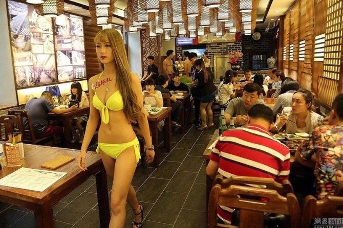 В Китайской Народной Республике в городе Шэньян, провинции Ляонин с 2015 года работает ресторан в котором официантки работают в мини-униформе. Это, как один из методов маркетинга, что хочешь сделай, но чтобы клиенты шли. Позже появились недовольные дамы,заявившие,что так дело не пойдет: "Оденьте официанток". Но клиенты ресторана мужчины остались при своём и владельцы ресторана всем довольны. Ресторан «Fresh Feast» работает в городе Тайбэй, Тайвань. Здесь очень сильная конкуренция между злачными заведениями, и чтобы отличиться рестораторы придумали нанять симпатичных официанток в бикини. Это произвело очень сильное впечатление и клиенты пошли просто толпой, конечно, чтобы вкусно поесть! Американская сеть Hooters, насчитывающая в мире более 430 ресторанов, известна своими жареными крыльями, пивом, и невероятно привлекательными официантками. Twin Peaks - спортивный бар с более чем 50 точками по всей территории Соединенных Штатов и за рубежом, и они быстро завоевывают репутацию бара