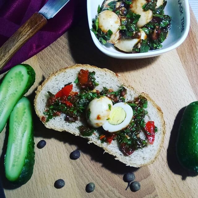 Анчоусы, петрушку, чеснок и перец порубить, добавить заливку и перемешать. Яйца сложить в банку, залить маринадом, накрыть крышкой и на ночь в холодильник.