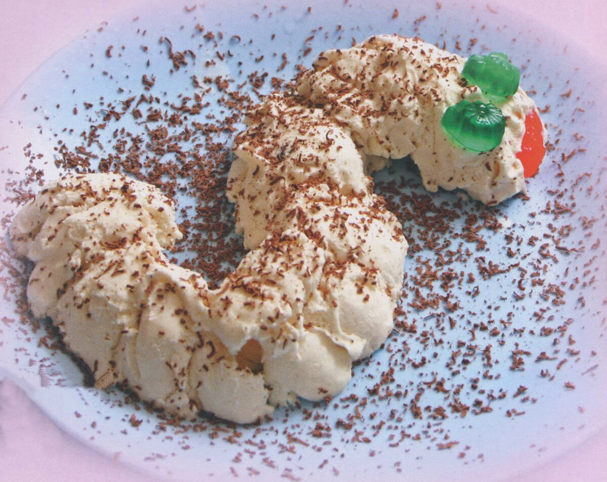 Ингредиенты: 200 гр. мороженого, 50 гр. шоколада, 20 гр. конфет или мармелада (небольших по размеру) Способ приготовления: Выложить мороженое в форму для выпекания печенья или кексов и поместить в морозильную камеру на 2-3 часа, чтобы мороженое хорошо застыло. После того, как мороженое охладится, вынуть его из морозильной камеры. Затем выложить на плоское блюдо и разрезать вдоль на две половинки. Сложить половинки так, чтобы получилась буква S. Шоколад положить в морозильную камеру, чтобы он стал твердым, натереть на мелкой терке и посыпать им половинки мороженого. Конфеты или мармелад положить на головку в виде глаз и носика. На заметку: Вместо шоколада можно использовать разноцветное драже.