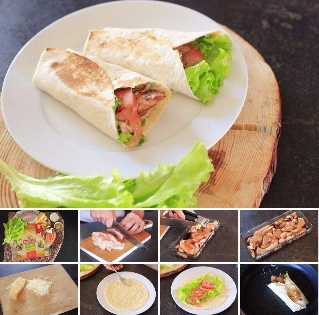 Ингредиенты: • Лепешка 1 • Куриное филе 100 г • Листья салата • Помидор • Сыр пармезан 20 г • Соевый соус 1 ч.л. • Жидкий мед 1 ст.л. • Чеснок 2 зубчика Для диетической заправки: • Белый йогурт 2 ст.л. • Горчица 1 ст.л. • Чеснок 1 зубчик Приготовление: 1. Куриное филе нарезаем полосками, заливаем маринадом и оставляем на 20 минут. 2. Берем лепешку и немного разогреваем ее в духовке для того, чтобы она не была сухой и ломкой при скручивании ролла. 3. Листья свежего салата моем и даем высохнуть. А тем временем натираем пармезан на мелкой терке. Нарезаем помидоры кольцами. 4. Кусочки курицы жарим на антипригарной сковородке. 5. Для соуса смешиваем йогурт, горчицу и чеснок. 6. Теплую лепешку смазываем соусом, выкладываем листья салата и дольки помидора. 7. Выкладываем кусочки курицы, посыпаем пармезаном и поплотнее скручиваем. 8. Отправляем на разогретую сковороду и держим секунд 10 с каждой стороны. Приятного аппетита!
