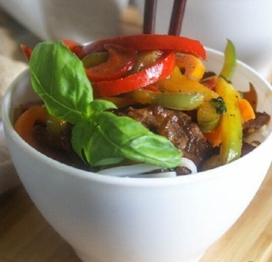 Мясо нарезаем на полоски и маринуем в соевом соусе. Нам понадобится сладкий перец и огурец, которые тоже шинкуем соломкой.
