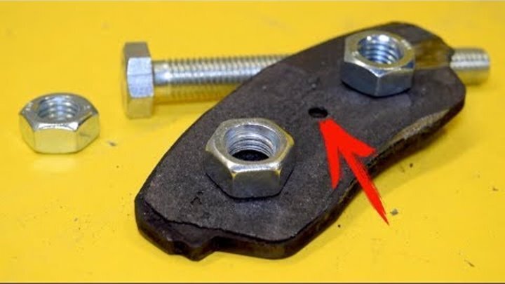 Привет, мои дорогие читатели! Сегодня я вам расскажу для каких целей можно применить старые тормозные дисковые колодки. Конечно же нам понадобится старая тормозная колодка, желательно более толстая и болт диаметром 14 мм, длиной где-то 120 мм, ну и несколько гаек к нему. Сначала просверливаем отверстие по центру колодки диаметром данного болта, т.к металл тут довольно толстый, будем сверлить сначала тонким сверлом и постепенно увеличивать диаметр. Готово! Теперь берем нашу гайку и привариваем таким образом, чтобы она была по середине отверстия. Для этого закручиваем гайку на наш болт, вставляем в отверстие и прижимаем другой гайкой с обратной стороны. Остается только приварить. Далее нужно будет выкрутить болт и заточить начало резьбы под конус. Затем берем еще две гайки и привариваем их друг напротив друга шляпкой болта. Заворачиваем болт в колодку и самоделка почти готова, но в процессе испытания выяснилось, что ее нужно немного укоротить. Заодно следует ее зачистить, чтобы не было