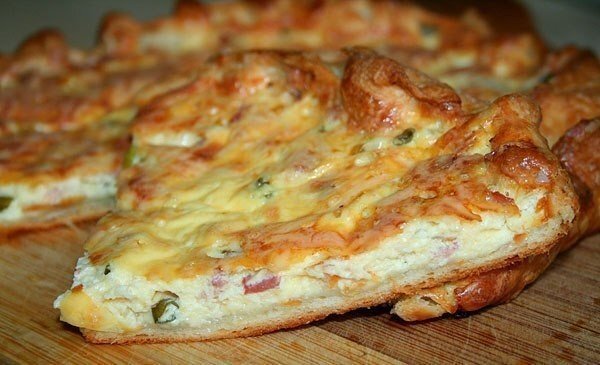 Рецепт вкусного и простого в приготовлении пирога всегда может выручить если не знаешь, что можно приготовить. Ингредиенты: Готовое слоеное дрожжевое тесто Соленый огурец Ветчина 200г. Сыр 150г. Зеленый лук Яйцо 1 шт. Сметаны 2 ст.л. Соль, перец по вкусу. Способ приготовления: Размораживаем наше готовое тесто. Берем огурец и режим его кубиками, ветчину и лук то же нарезаем. Берем сыр и трем его на крупной терке. Начинаем раскатывать наше тесто и ложем его на противень на котором будем выпекать. Раскатанные пласты протыкаем вилкой, чтобы пирог не вздулся. Ложем первый слой половину тертого сыра и зеленого лука. Потом слой соленого огурца и ветчину. Сверху посыпаем тертым сыром. Оформляем края у пирога. Берем сметану перемешиваем ее с яйцом, немного солим и перчим получившуюся смесь хорошо взбиваем. Аккуратно заливаем сверху наш пирог взбитой смесью. Отправляем наш пирог в духовку и запекаем минут 40 при температуре 180 градусов. Вот и все наш пирог готов можно кушать. Также вы может