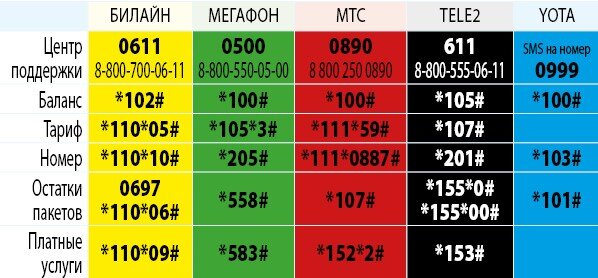 Полезные номера и команды Билайн, МегаФон, МТС, Tele2, Yota