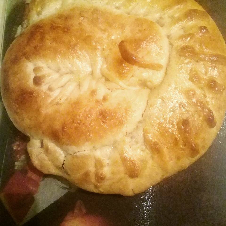 Тесто для этого пирога получается мягким и вкусным, начинка тоже хороша, но главная фишка — то, как я его заворачиваю. Об этом — читайте ниже. 1) Готовлю пирог на дрожжевом тесте: размешиваю пол-литра тёплой воды, чуть больше больше половины чайной ложки сухих дрожжей, 1 столовую ложку сахара с небольшой горкой, 1 чайную ложку соли без горки и 1/4 стакана растительного масла. Даю постоять примерно 5-10 минут. Постепенно подсыпаю муки, вымешивая тесто ложкой. Если тесто загустело настолько, ложкой трудно мешать, смазываю руки растительным маслом и вымешиваю тесто руками. Муки добавляю постепенно: нам нужно мягкое, но в меру упругое, чтобы его можно было раскатать скалкой. Ставлю миску с тестом на полчаса в холодильник. 2) Достаю тесто, обминаю, отрезаю кусочек с кулак. Раскатываю в лепешку толщиной 0,5 см. Немного отступив от края лепешки, тонким слоем выкладываю начинку. Затем сворачиваю аккуратно в рулетик и укладываю швом вниз в форму, смазанную маслом или выложенную пекарской бум