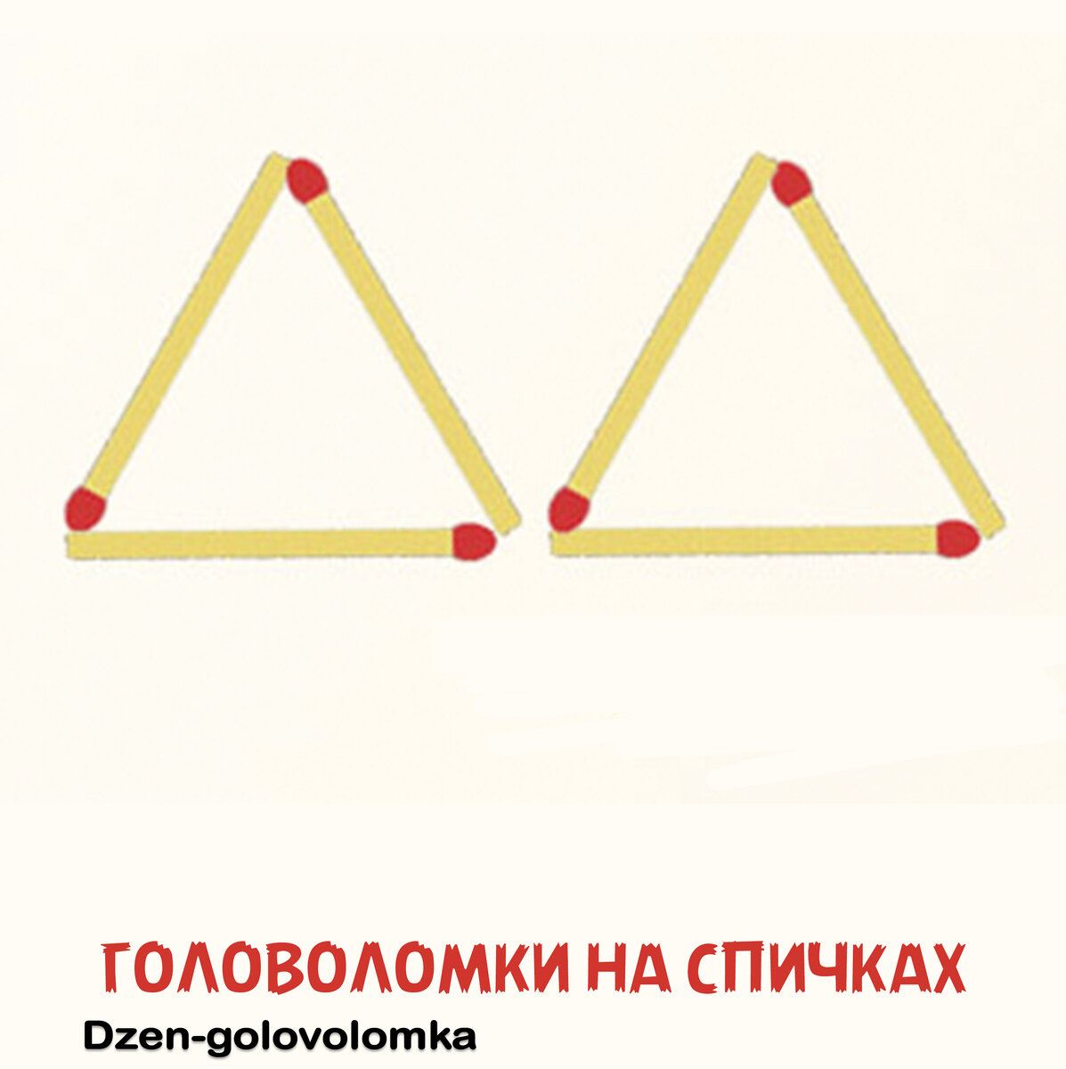 Примите очередной вызов! Устройте себе мозговой штурм! Перед Вами 2 треугольника состоящих из 6 спичек. Передвиньте 1 спичку так, чтобы получилось "4" одинаковых треугольника. Ссылка на публикацию с ответом на задачу № 8. Захотелось написать автору канала, пишите: dzen-golovolomka@yandex.ru