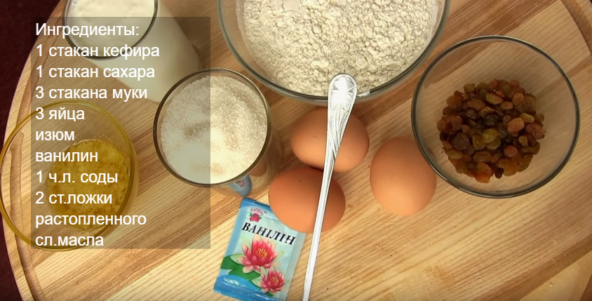 Минимум затрат по времени. Минимум ингредиентов - максимум удовольствия для всех членов семьи. Необычайно нежные и воздушные домашние кексы обязательно порадуют Ваших домочадцев. Перемешиваем яйца с сахаром и ванилином. В эту смесь добавляем кефир, соду и растопленное масло, перемешиваем. Добавляем муку и изюм и перемешиваем. Получаем тесто, как на оладушки. Смазываем формы любым маслом, наполняем примерно до половины формы и выпекаем 20 минут при температуре 180 градусов. Последний штрих - посыпаем сахарной пудрой и приятного аппетита!