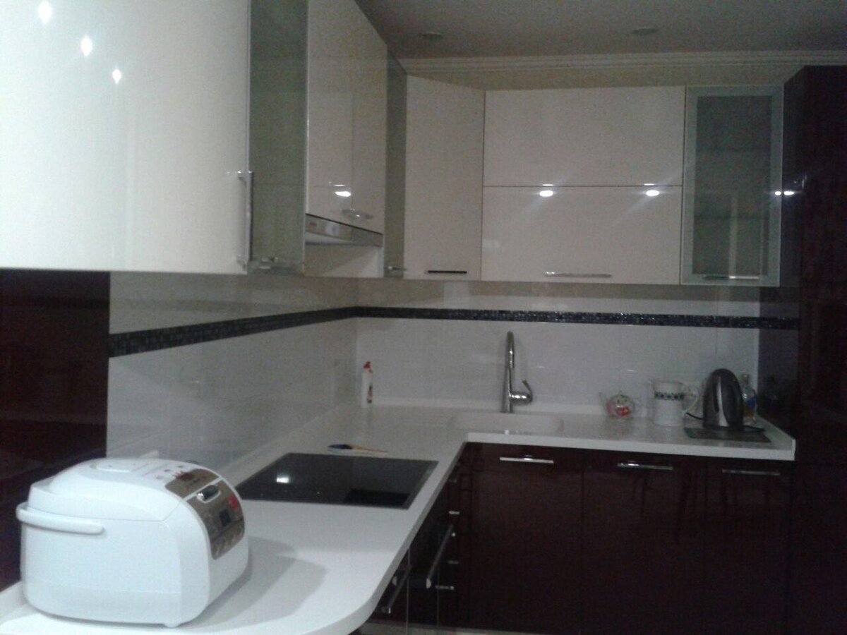 Немного о мебели! Выбирая гарнитур для кухни,первое,на что обращают внимание-это мебельные фасады.Помимо разнообразной цветовой гаммы,они имеют множество эксплуатационных характеристик,главной из которых будет материал.Этот критерий определяет прочность,гигроскопичность и термическую стойкость,а также служит залогом долголетия мебельных групп и предоставляет широкие возможности ро интерьерному оформлению.На фото используеться МДФ + пластик.С этого места по подробнее.МДФ -это аббревиатура и в переводе с английского (Medium Density Fibreboard) означает "древесноволокнистая плита,имеющая среднюю плотность".МДФ можно покрыть пленкой или пластиком.Плюсы пластика в качестве кухонных фасадов.1.Водостойкость и абсолютная гигиеничность.2. Не выгорают под воздествием солнечных лучей. 3.Большой ассортимент расцветок и возможность нанесения рисунка.4.Легко отмываеться от жирных загрязнений.