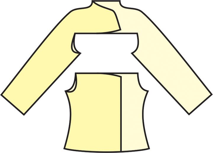 В любом деле самое страшное — рутина и однообразие, поэтому мы всегда находимся в поиске новых идей и технологических решений. Интересно, когда простое кажется сложным, а сложное — простым. Для нового эксперимента нам потребуется 70 граммов волокон вискозы, 300 граммов шерсти мериноса и 200-250 граммов флиса Коридейл двух оттенков. Сегодня мы вернемся к нашей старой выкройке жакета с воротником-стойкой, состоящей из деталей основы и кокетки с рукавом, но сваляем его немножко по-другому. Обычно мы соединяем детали в процессе валяния, чтобы изделие выглядело единым целым; но в этот раз наша задача — выделить различные фактуры и сделать акцент на объеме рукава и дополнительных деталей. Мы предлагаем еще один вариант соединения деталей швом внакладку. Модифицируем выкройку, как показано на схеме, чтобы получить необходимый объем рукава. Дополнительные блокираторы в форме «капли» пришиваются по центру передней и локтевой части выкройки. Приступаем к работе с детали спинки кокетки. Все дета