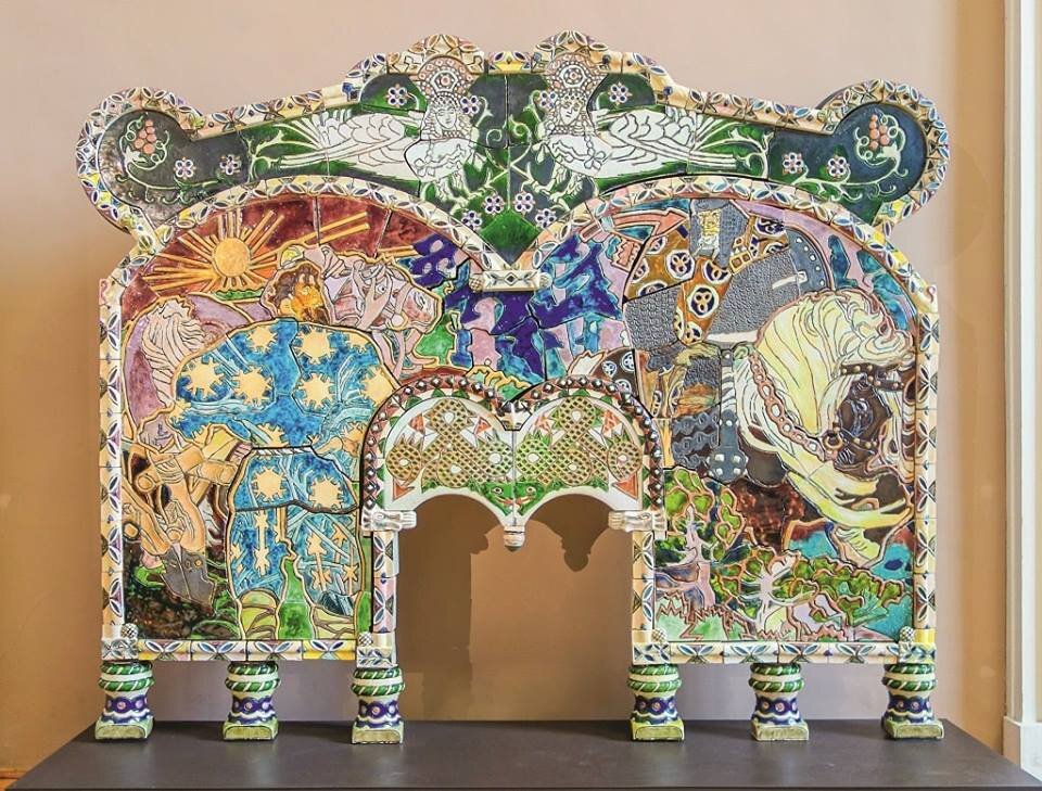 История создания керамического камина «Микула Селянинович и Вольга» (1898-1900, ГТГ) восходит ко второй половине 1890-х годов, когда М.А. Врубель по заказу С.И. Мамонтова написал два монументальных панно для Всероссийской нижегородской выставки 1896 года. Оба панно стали основой для последующих воплощений в керамике. В основу сюжета панно, а затем камина легла русская былина о Вольге и Микуле. Направляясь за данью во вверенные ему князем Владимиром города, Вольга встречает землепашца Микулу Селяниновича, богатырская сила которого изумляет его. Он просит Микулу проводить его в те города, где должен собирать дань.