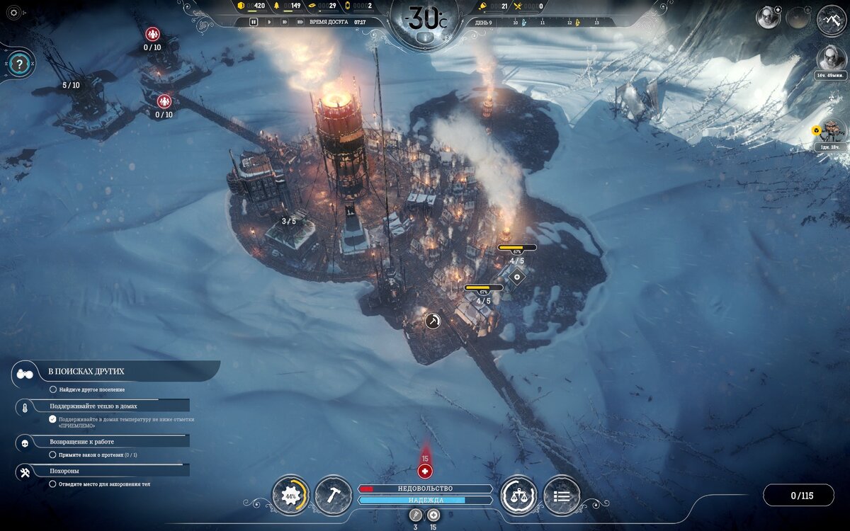 Если совсем коротко - это полный восторг. Хоть пока наиграл всего несколько часов, впечатлений накопилось масса, и я надеюсь, что этот пост окончательно развеет ваши сомнения относительно целесообразности приобретения Frostpunk. О чём это? Это игра о лишениях, выживании и надежде. Здесь постоянно придётся делать выбор между плохим и очень плохим, между правильным и эффективным. Как и This War of Mine (предыдущая игра от 11 bit studios), Frostpunk ставит перед игроком очень неприятные вопросы, о которых не хочется думать сидя дома с чашечкой чая в тёплом кресле. Что делать с бесполезным калекой, который потерял ногу, добывая уголь для остальных, когда пайков не хватает даже на детей? Заставить ли этих самых детей работать на морозе, в условиях катастрофической нехватки рабочих рук, или приказать строителям работать внеурочно, чтобы построить для малышни приют? Вот об этом и вся игра, это в ней главное, а не количество добытых ресурсов и размер поселения. Визуал и звук На каком-то про