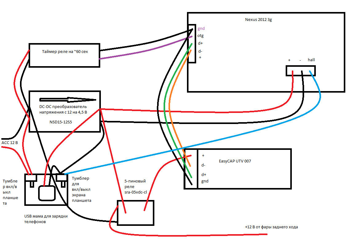 Поясню для чего реле задержки необходим для 3G версии планшета (tilapia). Дело в том, что если на момент включения планшета подключен otg кабель (в котором замкнуты gnd и otg кабели), то easycap не будет работать. Для этого мы через реле задержки соединяем их через 60 сек. В wifi версии планшета (grouper) этого бага нет…