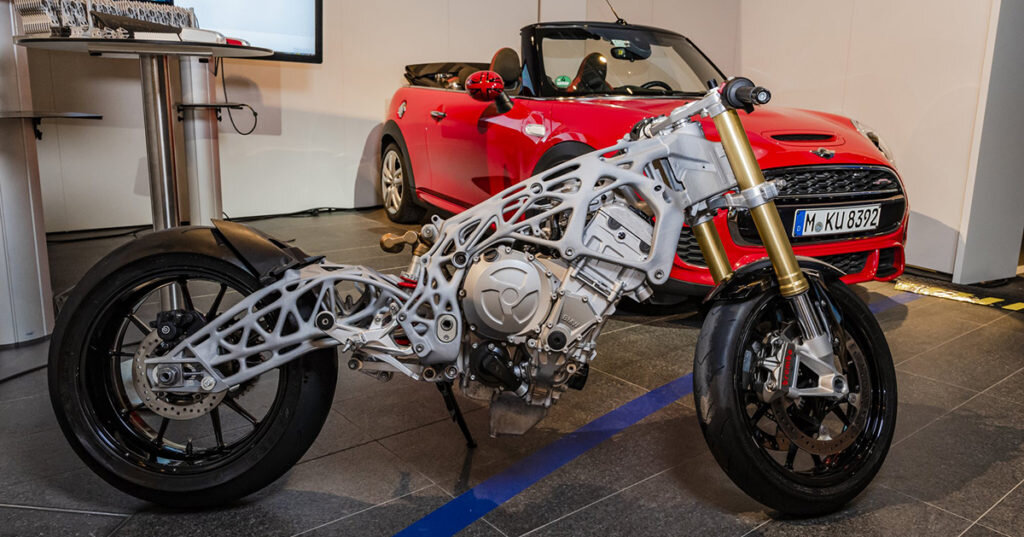 Не так давно мы рассказывали об экспериментах BMW с композитными элементами подвески, в частности маятниках, а на днях немцы снова удивили всех людей, еще на шаг приблизив будущее. На этот раз площадкой для демонстрации возможностей инженеров бренда стала конференция Digital Day 2018, в рамках которой баварцы представили мотоцикл, напечатанный на 3D принтере. Разумеется, не целиком – высокий полет инженерной мысли и технических достижений демонстрировали на раме и маятнике, полностью напечатанными из металла. Технология печати металлом напоминает обычную 3D печать, с той лишь разницей, что слой за слоем наплавляется не термопластик, а тонкие пласты алюминия. Новая технология, вне всяких сомнений, сможет вывести мотоциклетные шасси на качественно новый уровень, однако, даже сами представители BMW признают, 3D-печать слишком дорога, а главное – не быстра в производстве, и из-за этого пока не подходит для применения на серийных мотоциклах. Впрочем, если для конвейера такая те