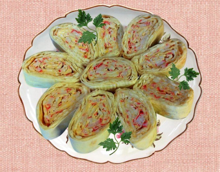 Очередной шикарный рецепт на каждый день от моей любимой бабули прямиком из деревни! Бекон в данном случае придает необычное сочетание вкуса сочного мяска и крабовых палочек. На начинку можно нанести сеточку из майонеза, получится сочнее. Нам понадобятся: 1 лист лаваша • 2 огурца • 3 яйца • 100 г моркови по-корейски • 100 г сыра • 100 г бекона • 100 г крабовых палочек Приготовление: Яйца сварить. По отдельности натереть на мелкой терке бекон или копченую колбасу, яйца и сыр. Огурцы натереть на крупной терке, слегка отжать. Морковь по необходимости отжать. На лаваше разложить подготовленные ингредиенты и палочки в несколько рядов, чередуя цвета, свернуть рулетом. Оставить в холодильнике на пол-часа. Обязательно ставьте палец вверх, чтобы видеть больше наших уникальных рецептов!
