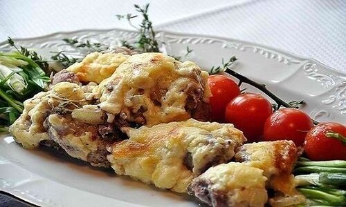 5. Мясо по-французски со сливками и пармезаном запекать около часа, сначала при 180 градусах, а потом при 150 градусах. Чтобы верхняя корочка не подгорела можно в конце прикрыть фольгой.