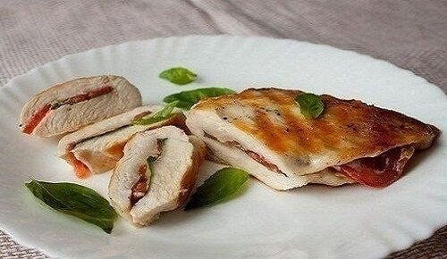 2. Заполнить каждую грудку базиликом и кусочками помидора, заколоть края зубочистками.