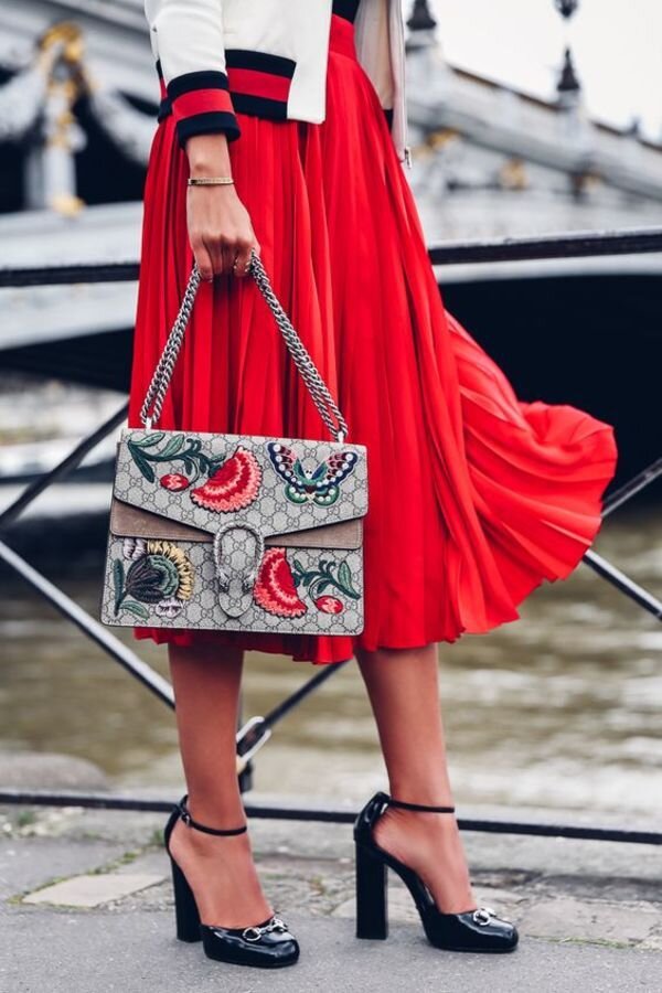 Красная юбка уже является акцентом в наряде. Поэтому нужно грамотно подбирать к ней вещи и аксессуары.