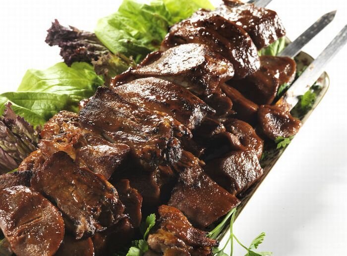 Как сделать мягкий, нежный шашлык из печени? Когда-то я, думала, что шашлык из мяса-это шашлык, а шашлык из печени-это сухая печень, что-то не вкусное, какая-то ерунда, но мне посоветовали приготовить особым способом и только тогда я поняла, как сделать шашлык из печени блюдо, которое покушав один раз, будешь желать ещё и ещё. Попробуйте, уверена, не разочаруетесь! Рецепт шашлык из печени. Вес продукта даны в граммах на 150 грамм жаренной печени. Печень говяжья или баранья в сыром виде и очищенная от пленок и сосудов 220 Жир свиной или курдючный 100 Соль по вкусу Масса жаренной печени 150 Масса жаренного сала или жира 40 Как готовить: Печень разморозьте на половину или чут