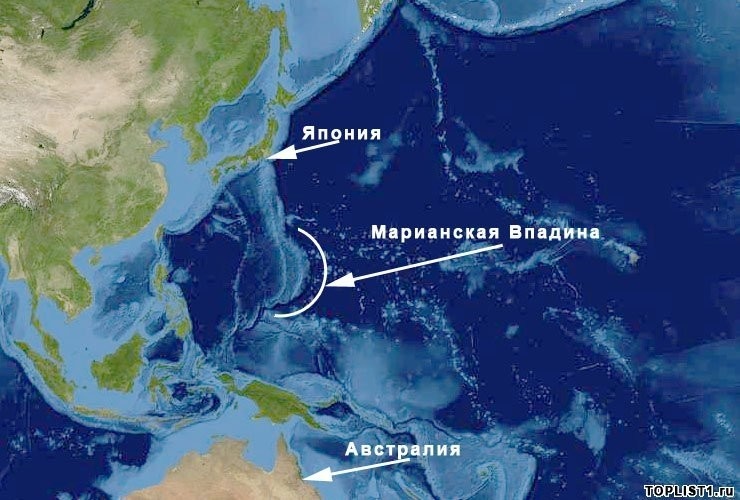 Самое глубокое место в мире — Марианская Впадина. Находится она в западной части Тихого Океана недалеко от Марианских островов, в честь которых и была названа. Протяженность Марианской Впадины около 1500 километров. Дно плоское шириной 1-5 км. Недавно на дне было обнаружено наличие гор высотой до 2,5 км. По данным исследований 2011 года максимальная глубина Марианской Впадины в самом глубоком её месте, названной Бездна Челленджера, составляет 10994 с погрешностью +/- 40 метров. Впадина образовалась на стыке Тихоокеанской и Филиппинской тектонических плит. Открытие и первое измерение глубины Марианской Впадины произошло в 1875 году. Тогда британцы намеряли 8 367 метров. А в 1951 году нашли глубину уже в 10 863 метров. Впервые люди погрузились на дно Марианской впадины 23 января 1960 года на батискафе «Триест». Это были исследователь Жак Пикар и лейтенант американских ВМС Дон Уолш. Тогда то и было доказано, что жизнь есть даже на таких глубинах. На дне обнаружились плоские как камбала