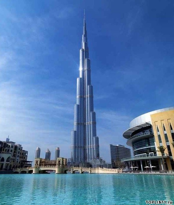 Самое высокое здание в мире — «Бурдж-Халифа» — небоскрёб высотой 828 метров находится в Дубае. По форме он очень похож на сталагмит, ну или очень большую зубочистку. Знаменательное открытие состоялось 4 января 2010 года в самом большом городе Объединённых Арабских Эмиратов — Дубае.