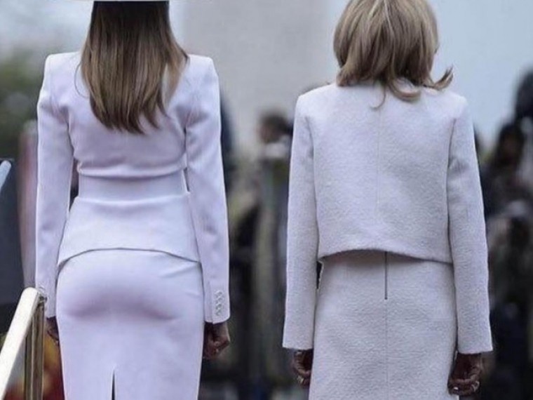 Накануне в США состоялась встреча Эммануэля Макрона и Дональда Трампа. Президенты явились на неё вместе со своими супругами. Пользователи соцсетей бурно обсуждают снимки со встречи. Но особое внимание привлекла фотография, на которой чётко можно разглядеть ягодицы Меланьи Трамп и Бриджит Макрон. Обтягивающая белая юбка выгодно подчёркивает формы первой леди США. А вот филейная часть жены президента Франции на её фоне смотрится, мягко говоря, не слишком выигрышно. «Элегантная женщина и парень в юбке», «Мать и дочь» — как только не сравнивают пользователи фигуры Меланьи и Бриджит. Особо остроумные комментаторы посоветовали супруге Макрона носить нижнее белье с «пушап-эффектом». Другие же решили от слов перейти к делу и сделать коллажи.