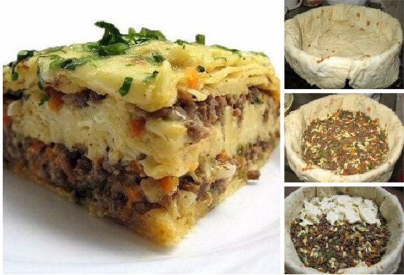 После нужно остатки фарша расположить сверху кусочков смоченных в кефире и накрыть все это дело целым лавашом.