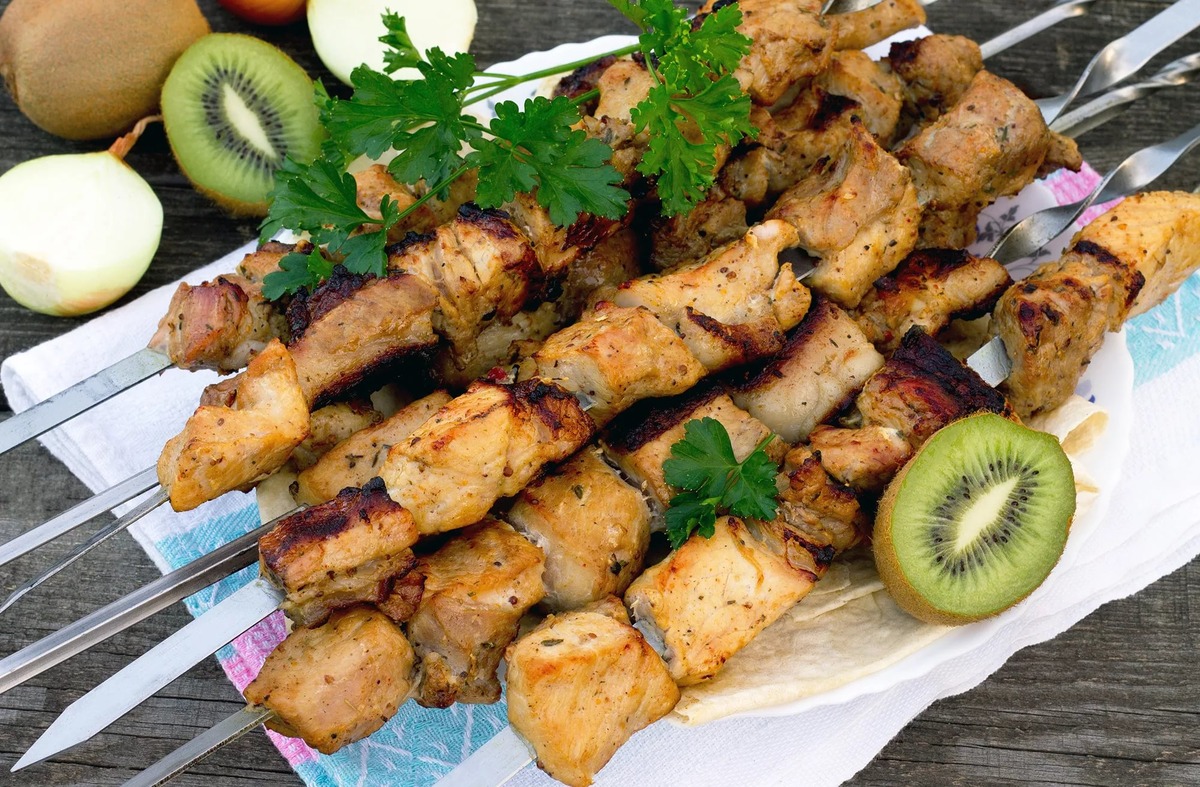 Замаринованный в киви. Ингредиенты: Мякоть говядины 1 кг Лук репчатый 2 шт. Лавровый лист 4 шт. Перец чёрный 6 горошин Киви 1 шт. Газированная минеральная вода 200 миллилитров Приготовление: Говядину очистите от плёнок и жил, вымойте, нарежьте кусочками размерами 5-6 см. Лук очистить и нарезать средними ломтиками. Выложите мясо и лук слоями в кастрюлю, добавьте лавровый лист и перец горошком. Киви очистите, натрите на мелкой тёрке, добавьте в кастрюлю и всё как следует, перемешайте. Влейте минеральную воду и ещё раз перемешайте. Уберите кастрюлю в холодильник на 2 часа. Очистите мясо от маринада, нанижите на шампуры и жарьте на седых углях 30-35 минут, периодически переворачивая, до готовности и румяной корочки. Приятного аппетита.