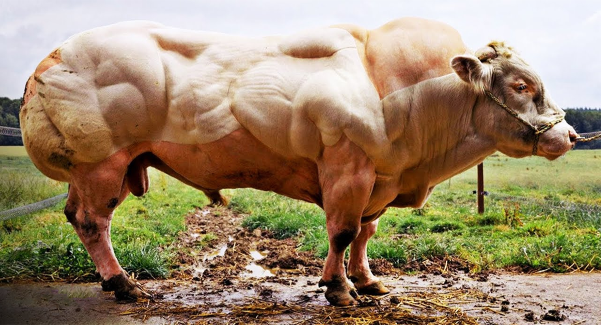 Селекционеры умеют удивлять. Не исключением стали и селекционеры из Бельгии, которые подарили миру интересную породу бельгийских голубых коров. Но не нужно пугаться этих милых качков, стоит узнать о них побольше. Бельгийская голубая корова похожа на перекачанного бодибилдира, которому не знакомо чувство меры. Однако буренки не виноваты в этом, когда-то они были самыми обыкновенными коровами. В чем же дело? А дело как известно в мелочи – в гене, который регулирует и ограничивает рост мышечной массы у животного, миостанине. Если суметь заблокировать его, то мышцы животного без прилагаемых усилий и посещения дорогих спортзалов будут расти как на дрожжах. В конце 19-го века бельгийцы с этой проблемой справились на «УРА»! Они скрестили местных коров молочных пород с английскими бычками-производителями. В результате получилась молочно-мясная порода коров, глядя на которую впервые, не веришь своим глазам. Минимум жира в теле и удвоенная мышечная масса не единственные особенности породы. На