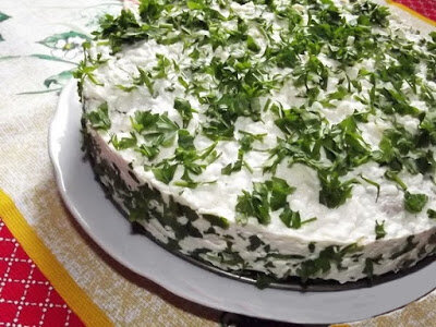 В форму уложить корж, полить горячей сырной массой, затем положить ещё один корж и снова полить сырной массой. Оставить торт пропитываться на 1 час. Готовый торт можно украсить мелко порезанной петрушкой или грибами.