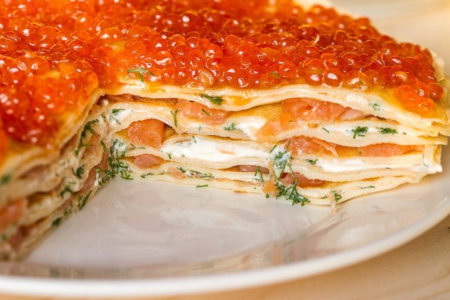 В России блины это самое любимое блюдо и существует много разновидностей блинов, с самыми различными начинками. А сам процесс приготовления этого лакомства может быть действительно захватывающим и интересным. Удивите свою семью, приготовив этот восхитительный блинный пирог с красной рыбой! ИНГРЕДИЕНТЫ: Для блинов: 650мл цельного жирного молока; 50мл теплой воды; 250г муки; 2 яйца; щепотка соли; 2 ст. ложки сахара; 2 ст. ложки подсолнечного масла; 1/3 ч. ложки пищевой соды; 1/2 ч. ложки лимонного сока или уксуса. Для начинки: 200г соленого или копченого лосося; 150г сливочного сыра; 2 ст. ложки сметаны; пучок мелко нарезанного укропа; красная икра. РЕЦЕПТ: Разбейте яйца в большую миску, добавьте соль, сахар и взбейте их. Влейте масло и молоко и снова продолжайте взбивать. Просейте муку в миску и тщательно перемешайте. Налейте теплую воду и взбивайте смесь, избегая появления комочков. Погасите соду лимонным соком или уксусом, быстро добавьте ее в тесто, слегка помешайте и на время оставь