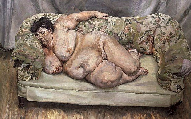 Такою гранью, для меня является картина Люсьена Фрейда - "Спящая социальная работница". Дряблое и уродливое тело немолодой женщины, что комично контрастирует с обычной обстановкой коммунальной квартиры. Эту картину, на выставках искусствоведы представляли, как современный парафраз знаменитой "Олимпии" Эдуарда Мане. Но давайте ощутим разницу. Возможно называть современной "Олимпией" соц работницу с неприкрытой без