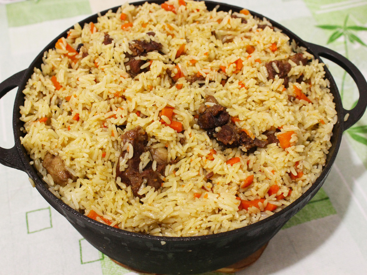 Это блюдо пришло к нам с Востока,но так прочно вошло в повседневную жизнь,что редкая хозяйка не включает это блюдо в своё меню. При приготовлении плова,у многих хозяек есть свои хитрости и советы,чтобы плов выглядел аппетитно и на вкус был пловом,а ни рисовой кашей с мясом.Готовьте по этому рецепту и у вас всегда будет удачный плов! Для приготовления потребуется: Мясо филе,свинина или говядина-400-500 гр.(можно сделать ассорти) Рис длинный или пропаренный-700-800 гр. Морковь-2 шт. крупные Лук-1 шт. крупный и 2 средние Соль,специи,перец по вкусу Чеснок-1 головка Масло растительное-100-150 гр. Для приготовления берем большой и глубокий казан,наливаем масло и ставим на огонь.Когда масло нагреется, выкладываем мясо и хорошо прожариваем,добавляем порезанный полукольцами лук,слегка обжариваем. Затем к мясу и луку добавляем морковь,натертую на крупной терке.Мне нравится, когда моркови в плове много,если вам нет,то используйте в меньшем количестве. Рис хорошенечко промываем в несколько раз.Мн