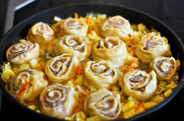 Очень вкусное и простое в приготовлении блюдо, которое обожают все мужчины в кубанских семьях! Под кубанскими штрумбами (их еще называют штруделями ) скрываются простые маленькие рулетики с мясной начинкой. Это как ленивые пелемени, в сочном соусе. На вкус они замечательные и очень сытные, да и готовить их довольно просто. Необычная форма нарезанных рулетов, напоминающих розочки, отлично смотрится на тарелках. Способ варки, который называется припусканием (с неполным погружением в воду) даёт удивительный эффект – изделия выходят похожими на паровые азиатские булочки. Использование разных начинок, включая овощные и сладкие (например, из орехов, изюма и цукатов), позволяет получить огромный спектр вкусов и типов блюд, начиная от основного блюда и заканчивая необычным десертом. Я советую вам готовить сразу большую порцию штрумбов: половину тушить в сковороде, а половину замораживать. Если вы не планируете замораживать штрумбы, то, количество указанных в рецепте ингредиентов, умен