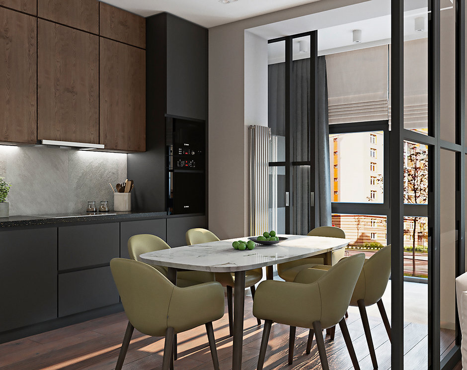 Перед дизайнером была поставлена задача – сделать просторную и многофункциональную квартиру для холостяка. Ставка была сделана на строгий, но уютный дизайн. Что из этого получилось читайте ниже! Немного о дизайне Чтобы однокомнатную квартиру превратить в студию, дизайнер зонировала пространство стеклянными перегородками на три части: кухня, гостиная, спальня. Дизайн интерьера было решено сделать строгим и без лишних декоративных элементов, но в теплых оттенках для придания атмосферы уюта и покоя. Чтобы не израсходовать весь бюджет на отделку, дизайнер выбрала относительно недорогую краску для покраски стен. В ванной использовали керамогранит отечественного производства. Гостиную и спальню отделали панелями из МДФ с целью разнообразить интерьер. Кухня Заказчик хотел очень много пространства на кухне, в связи с чем дизайнер выбрала кухонный гарнитур до потолка. Подобное решение визуально увеличивает кухню и отлично вписывается в современный дизайн интерьера. Более того, таким образом м