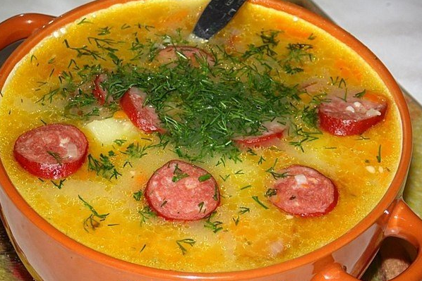 Пять штук охотничьих колбасок, один стаканчик гороха, одну штуку плавленого сырка, три картофелины, одна морковка, репчатый лук одна луковица, зелень на любителя, соль, перец по желанию, и масло растительное.