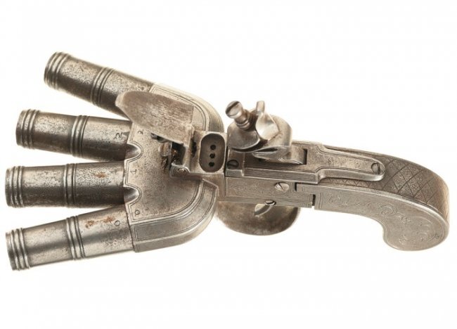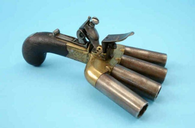 Конец 18-го века. Человечество начало задумываться об оружии, которое было бы компактным и вто же время поражала больше одной цели одновременно. Ведь тогда пираты отличались своей свирепостью, жестокостью и многочисленностью. На помощь беззащитным морякам пришёл пистолет Duck Foot. Как Вы сами понимаете, название данному пистолету дали из-за схожести расположения стволов с гусиной лапой. Мало того, что стволы располагались веером, все они ещё имели разный калибр. Нарезные стволы имели свойство сниматься.