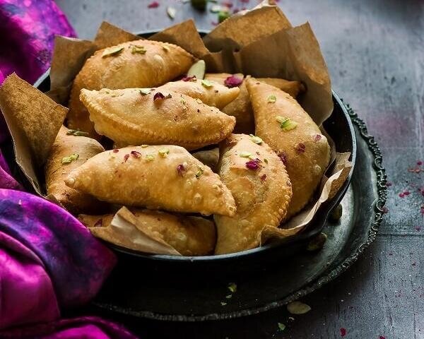 Ингредиенты: мука, манка, масло гхи, сухое молоко, кокосовая стружка, сухие орехи, сахар, изюм, кардамон Рецепт: Mawa Gujiya (Mawa Karanji) Мава Гуджия очень популярна во время индийских праздников. Mawa Gujiya богата и насыщена по вкусу, наполнена орехами, сухофруктами, кокосом и сухим молоком (mawa). В Северной Индии фестиваль Холи без Гуджии все равно, что Холи без цветов. Традиционно Гуджию обжаривают в растительном или топленом масле. Однако, в наши дни люди очень заботятся о здоровье, поэтому ниже 2 версии - жареная и запеченная. Автор и фото: @binjalsvegkitchen Что потребуется: