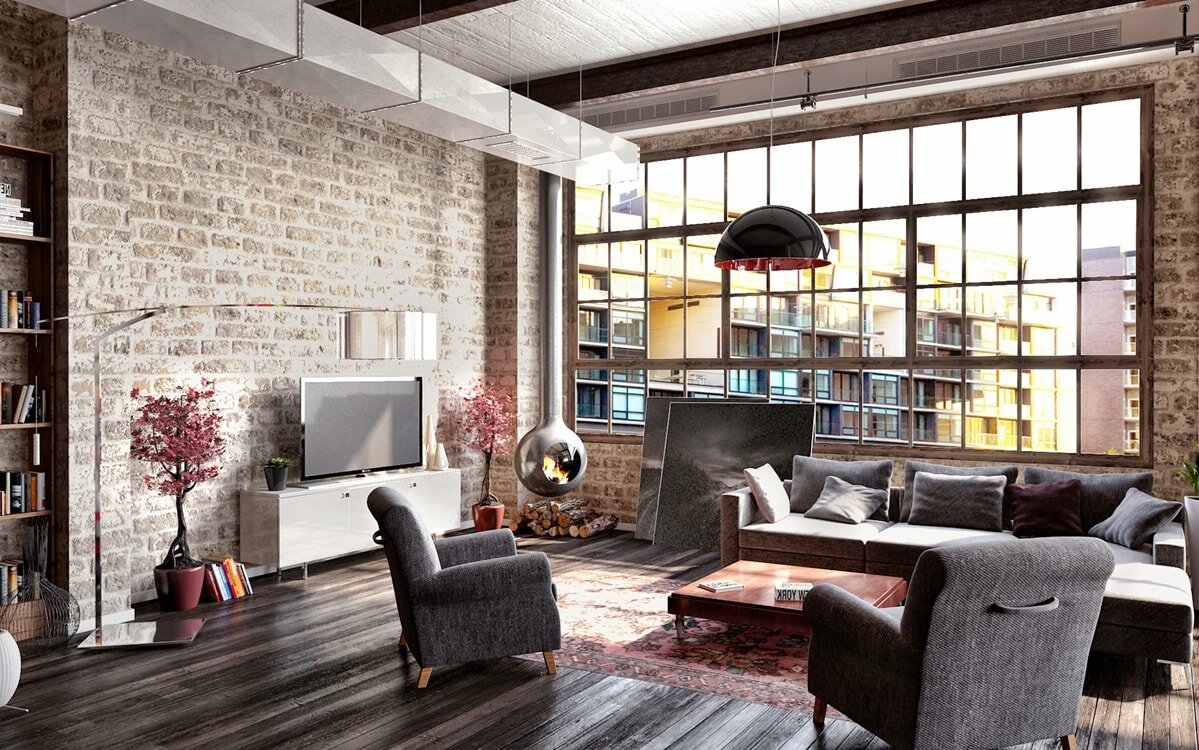 В этом стиле, стены не оклеиваются обоями, а для него характерна кирпичная кладка, деревянные конструкции, бетонная побеленная поверхность и натуральный камень. Высокие потолки, спускающиеся провода, фальш балки, металлические лестницы - все напоминает большие заводские помещения.