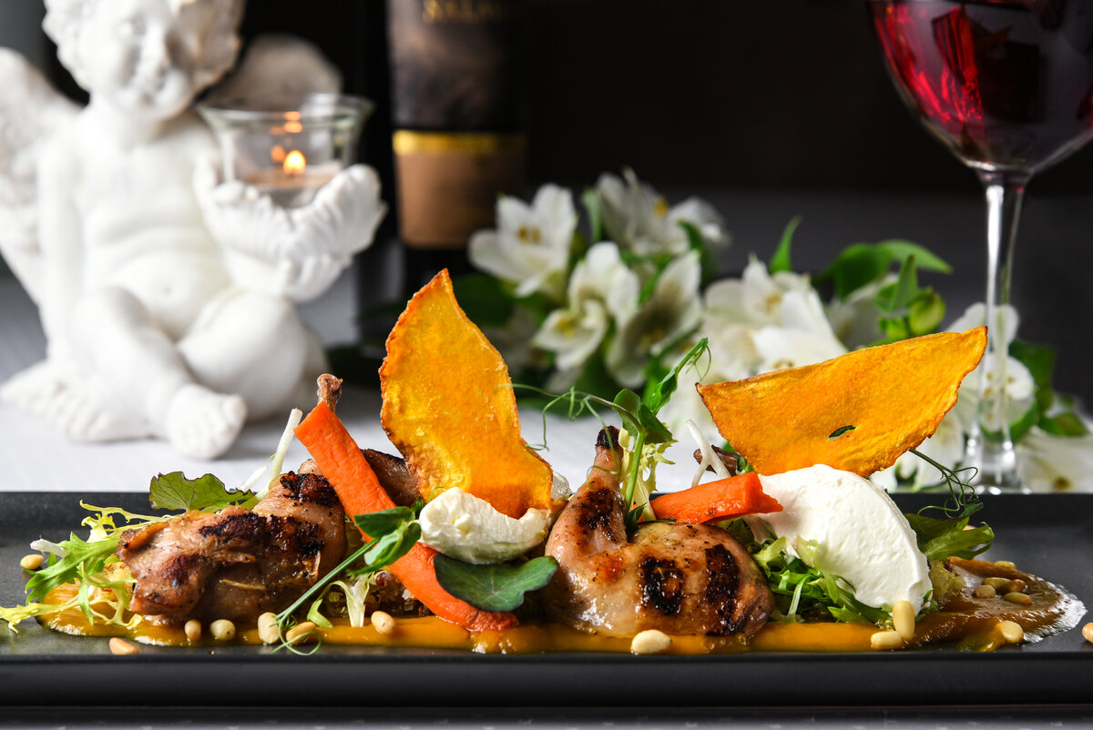 Салат с перепелкой, тыквенным пюре и глазированной в меду морковью