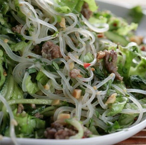 В последнее время во всём мире наблюдается повышенный интерес к блюдом из китайской кухни. Хотим рассказать вам об одном из простейших, но необычайно вкусных китайских блюд " Салат из рисовых макарон". Ингредиенты: Фарш (свинина или говядина) - 500 г. Салат - 1 пучёк Огурец - 2-3 шт. Рисовые макароны - 1 пачка Растительное масло - 2 ст. л. Арахис (жареный) - 50 г. Чеснок (мелко рубленный) - 2 зубчика Кинза (мелко рубленная) - горсть Для заправки: Масло (кунжутное) - 2 ч. л. Сахар - 2 ч. л. Перец красный (чили) - 1 шт. Сок лайма - половина Соль - по вкусу Соус (соевый) - 4 ст.л Натёртый имбирь - 1 ч. л. Чёрный перец (молотый) - по вкусу 1. На сковороде обжарить фарш и добавить к нему чеснок. 2. Согласно инструкции, приготовить рисовые макароны. 3. Макароны переложить к фаршу. 4. После этого тонкой соломкой нарезать огурцы и листья салата. 5. Соединить всё вместе и хорошо перемешать. 6. Посыпать салат порубленным арахисом. Подавать можно как тёплым, так и холодным. Приятного аппетита