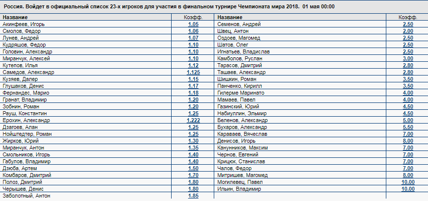 Очевидно, что коэффициенты на всех игроков уже "съели". На данный момент остались крутые варианты, которые можно играть крупно и прогадать можно только внезапными травмами. Кстати, если в последних турах кто-то из ключевых игроков сборной получит среднюю или тяжелую травму, то можно играть по большому коэффициенту человека из запаса на его позицию. В конце поста есть скрин всех вариантов. Черчесов в последних 4 встречах нашей команды играл в 3 защитника, именно так мы и будем играть на ЧМ. Давайте посмотрим, кто у нас выходил во последних 4 катках (исключаем 1) Лунёва - 1.07 и 2) Акинфеева - 1.05 3) Габулова - 1.4): 4) Кудряшов, 5) Смолов, 6) Миранчук Ал, 7) Ерохин (3 из них на замену), 8) Смольников (3 из них на замену). На этих ребята дают 1.1, 1.06, 1.1, 1.22. соответственно. По три раза выходили: 9) Глушаков - 1.17, 10) Жирков - 1.3, 11) Головин - 1.1 (осенью он не мог играть, а весной 2 игры в основе), 12) Дзагоев - 1.25, 13) Самедов - 1.12 (осенью он не мог играть, а весной